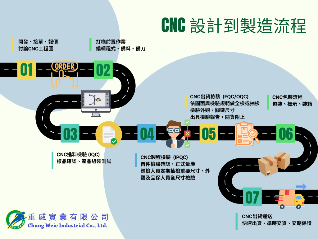 重威实业 CNC 加工流程:从需求讨论、程序编写、逐步质量检验至包装出货。